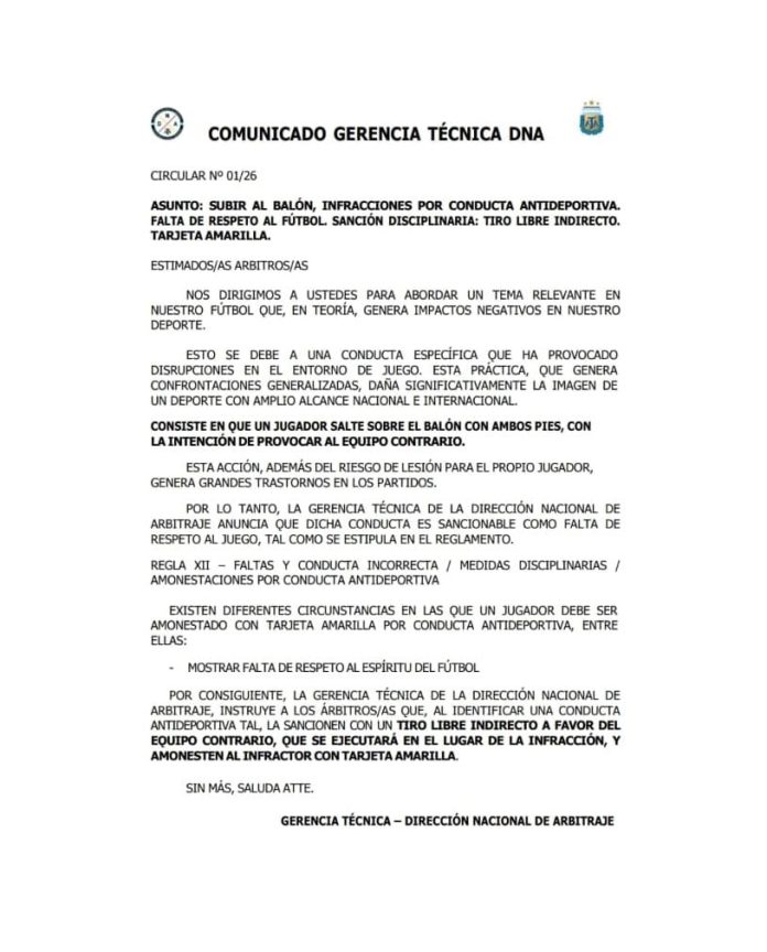 “Por lo tanto, la Gerencia Técnica de la Dirección Nacional de Arbitraje anuncia que dicha conducta es sancionable como falta de respeto al juego, tal como se estipula en el reglamento. Regla VII: Faltas y conducta incorrecta. Medidas disciplinarias. Amonestaciones por conductas antideportivas. Existen diferentes circunstancias en las que un jugador debe ser amonestado con tarjeta amarilla por conducta antideportiva, entre ellas: mostrar falta de respeto al espíritu del fútbol”, continuó.