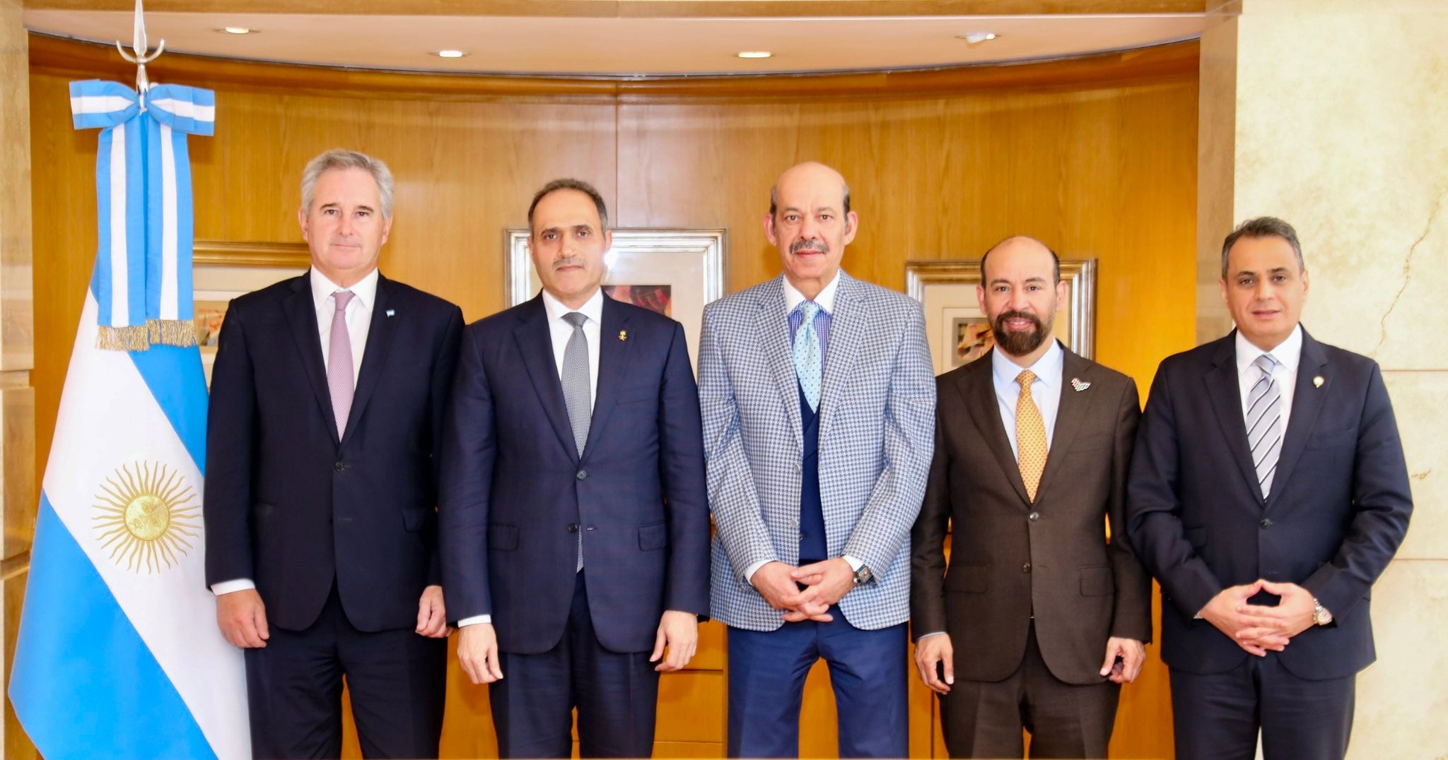 El canciller Pablo Quirno recibió a los embajadores de las naciones del Golfo en Argentina: de Arabia Saudita, Hatem Ghormulla Alghamidi, de Qatar, Battal M. Al Dosari, de Emiratos Árabes Unidos, Saeed Abdulla Alqemzi y de Kuwait, Abdulaziz Albisher (Cancillería Argentina)