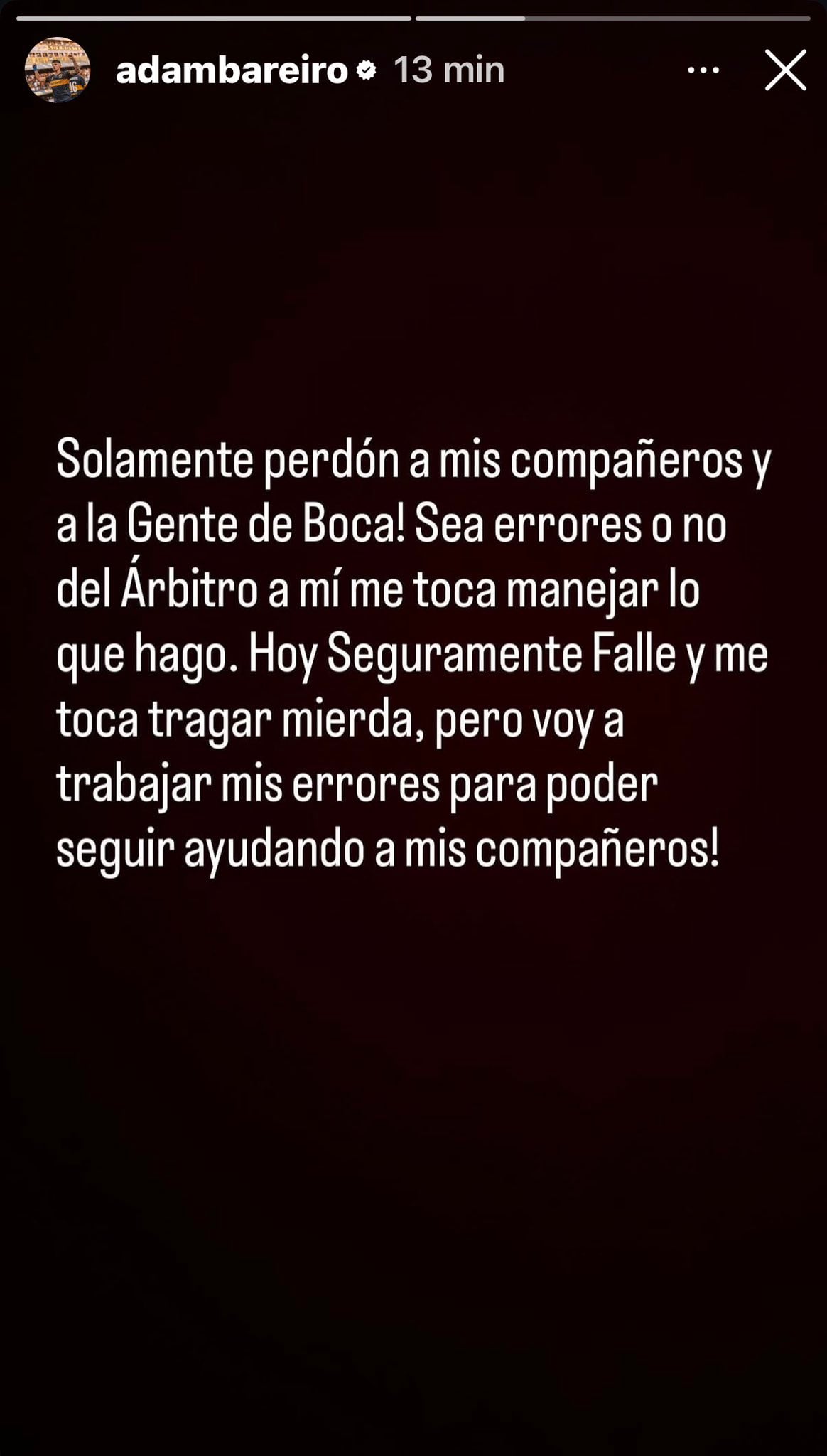 Con las revoluciones más bajas, Bareiro escribió un mensaje en las redes sociales donde se disculpó ante los hinchas pese a que entendió que el árbitro tuvo responsabilidad en su expulsión. “Solamente perdón a mis compañeros y a la gente de Boca! Sea errores o no del árbitro, a mí me toca manejar lo que hago. Hoy seguramente fallé y me toca tragar mierda, pero voy a trabajar mis errores para poder seguir ayudando a mis compañeros!”, fue su recado en las historias de Instagram.