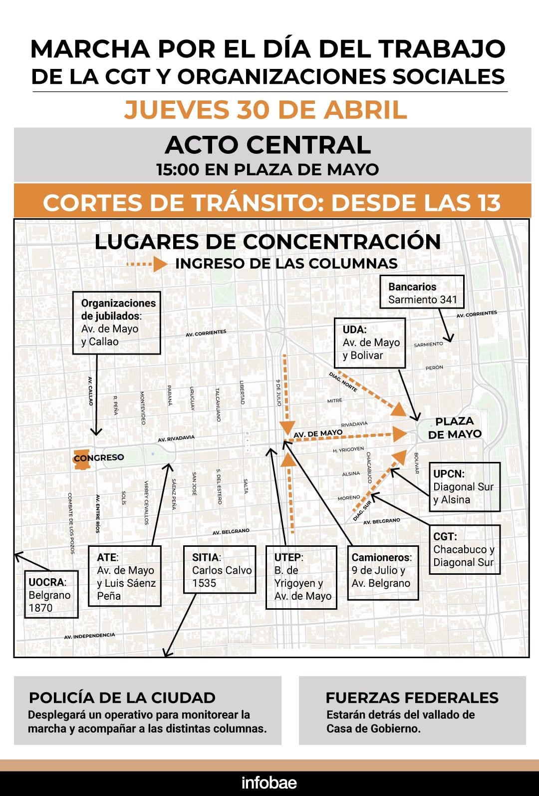 Esas arterias serán puntos de concentración de movimientos sociales enrolados en la Unión Trabajadores de la Economía Popular (UTEP); la Asociación de Trabajadores del Estado (ATE); Bancarios; el Sindicato de Trabajadores de la Industria de la Alimentación (SITIA); organizaciones de jubilados; el gremio de Camioneros; UOCRA; UDA y buena parte de los gremios que conforman la CGT. Las dos CTA y partidos y organizaciones de izquierda anticiparon que no coincidirán en el mismo acto para conmemorar el Día del Trabajador.
