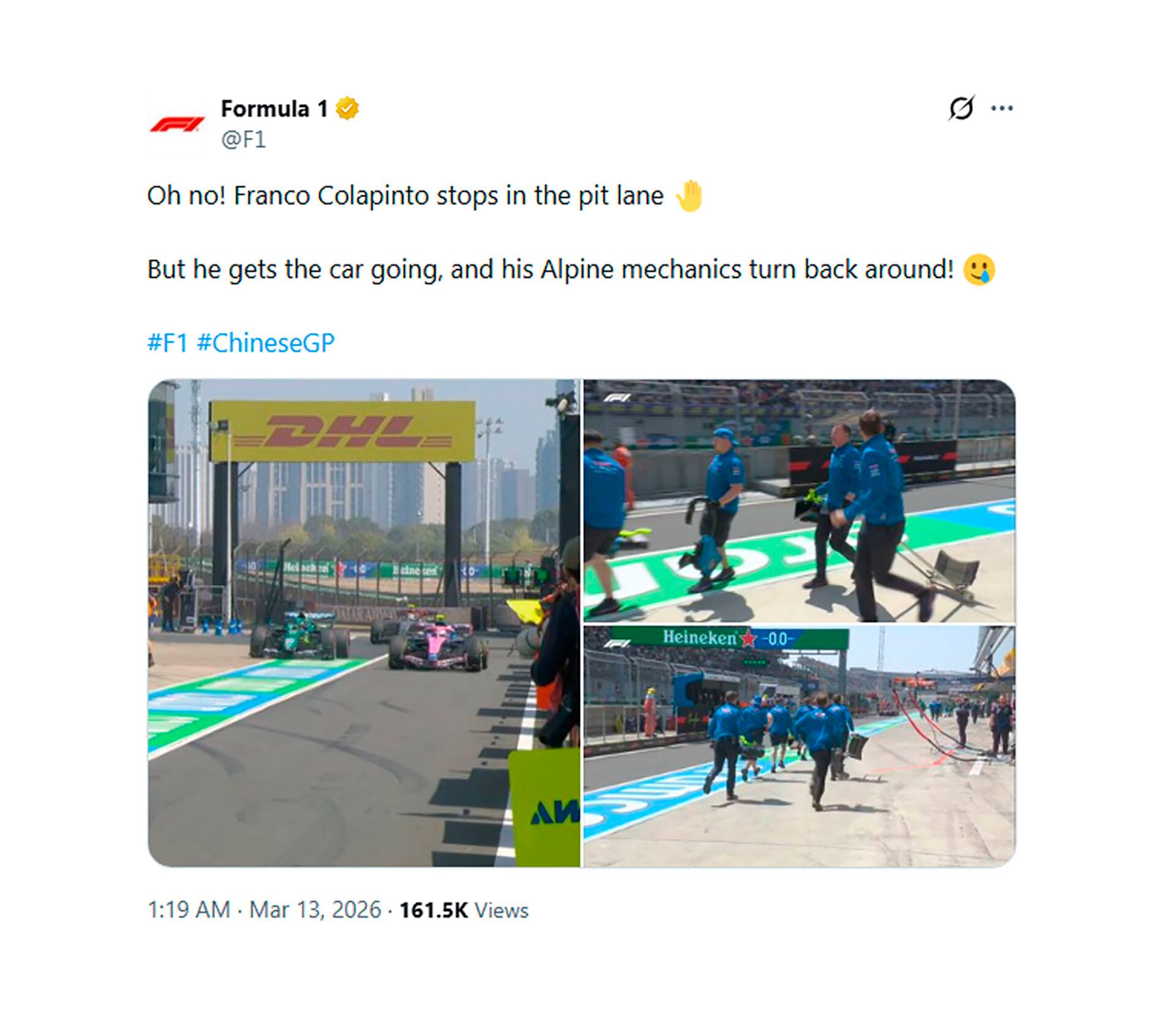 “¡Oh, no! Franco Colapinto se detiene en el pit lane. Pero él logra poner en marcha el coche, ¡y sus mecánicos de Alpine dan la vuelta!”, bromeó la Fórmula 1 en su cuenta de X (antes Twitter).