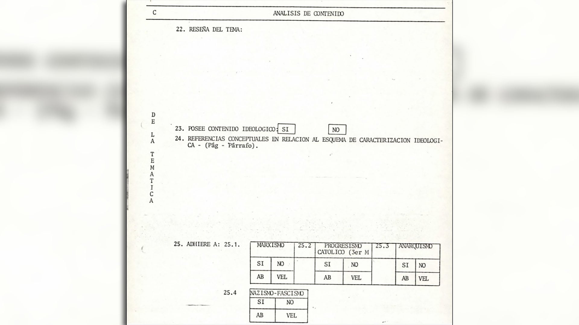 Luego, se efectuaba el análisis ideológico. Una vez reseñado el tema de la obra literaria o cinematográfica, se marcaba con un sí o un no si la misma poseía “contenido ideológico”. El siguiente paso era indicar “referencias conceptuales en relación al Esquema de Caracterización Ideológica”.