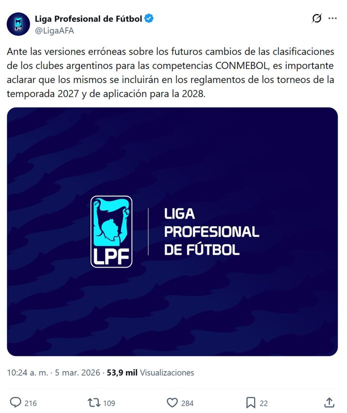 La Liga Profesional de Fútbol emite un comunicado en redes sociales para aclarar la inclusión de los cambios en las clasificaciones CONMEBOL en los reglamentos de 2027, con aplicación en 2028.