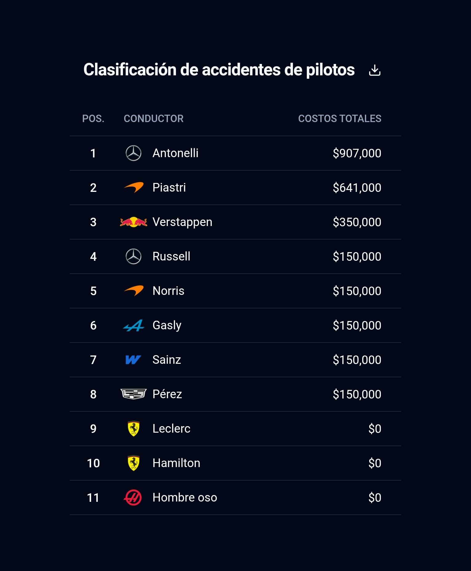 Según un relevamiento de gastos publicado en la plataforma X, el accidente más costoso recayó en Kimi Antonelli, quien protagonizó una fuerte colisión durante la tercera sesión de prácticas libres. El impacto contra el muro de la curva 2 provocó daños valuados en USD 907.000. Este incidente no le impidió competir y finalizó en segundo lugar, detrás de su compañero George Russell, quien también sumó gastos por USD 150.000 luego de que lograra la primera pole de la temporada y la carrera.