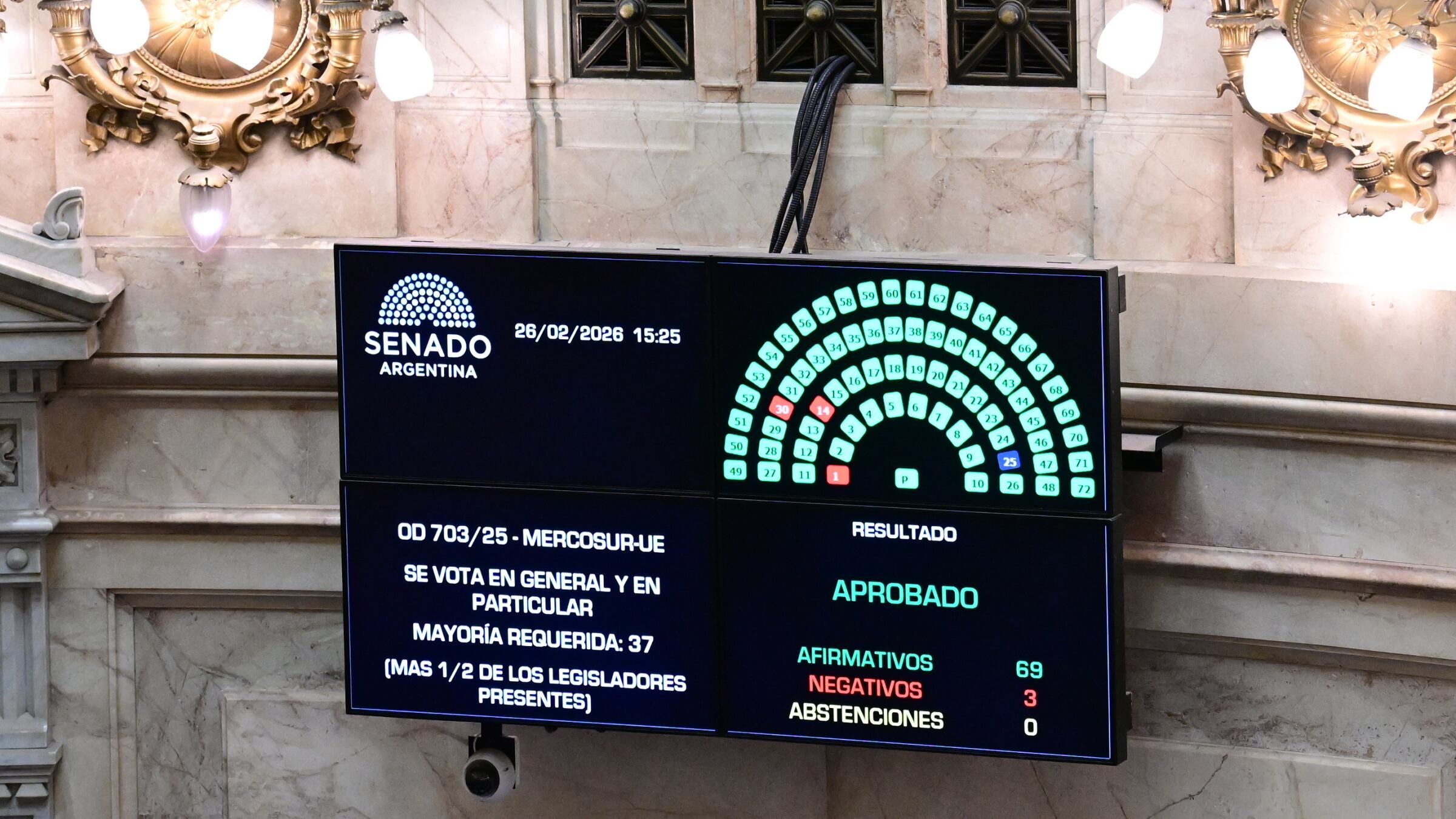 El Senado de la Nación sancionó ayer el acuerdo de libre comercio entre el Mercosur y la Unión Europea con 69 votos a favor y solo tres en contra en una sesión marcada por la expectativa política tras más de 25 años negociaciones.